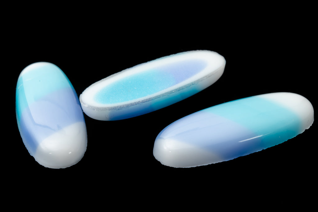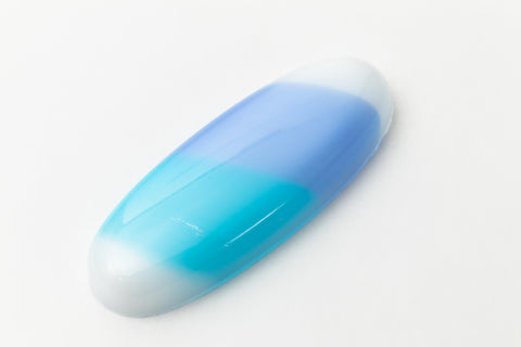 10.1mm x 26.3mm white oval flat back with diagonal bands of aqua and periwinkle blue.