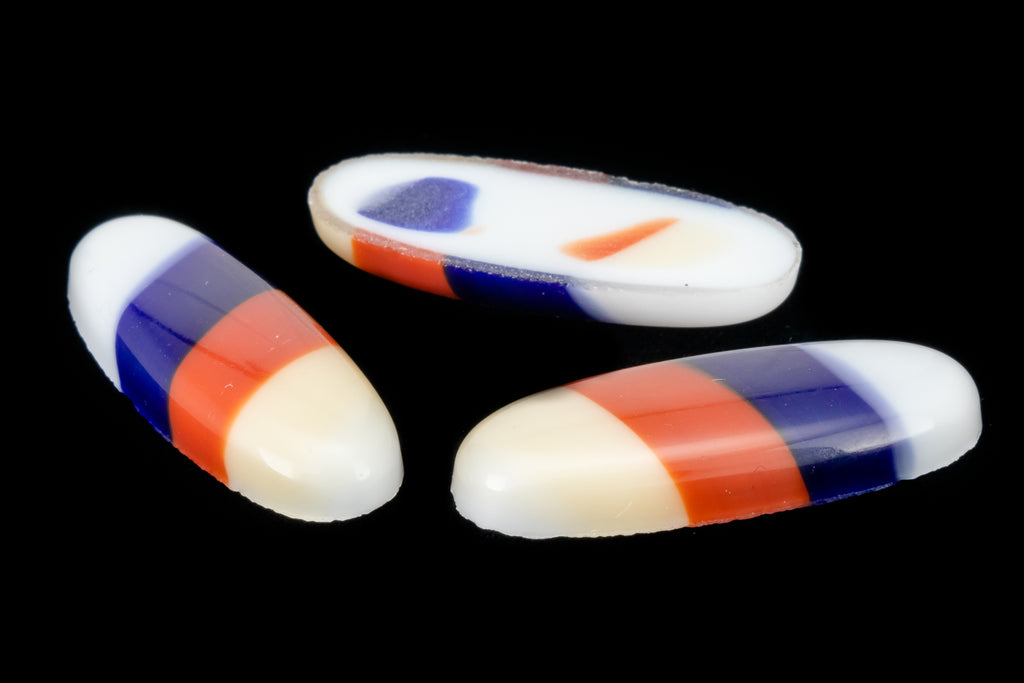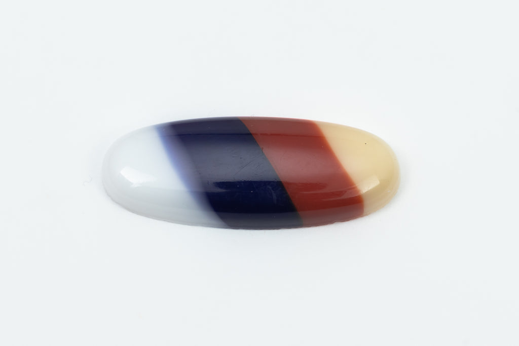10.2mm x 26.26mm white oval flat back with diagonal bands of beige, red brown and Navy blue.