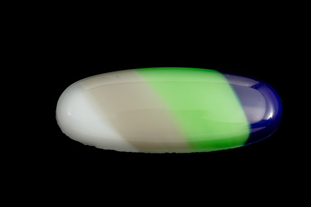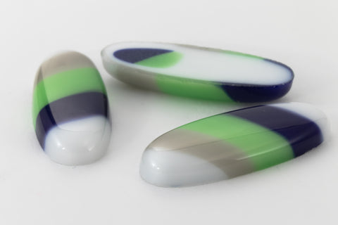 10.06mm x 26.26mm white oval flat back with diagonal bands of gray, leaf green and dark blue.