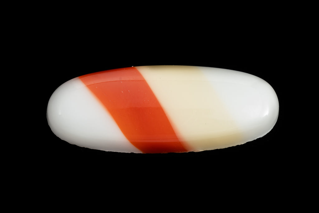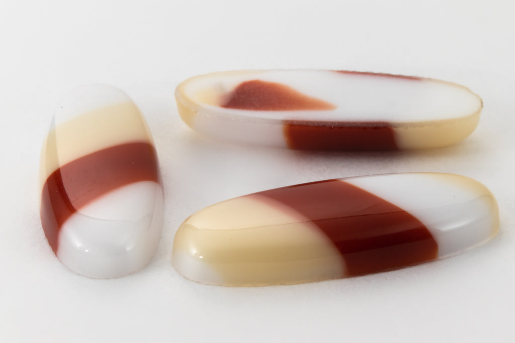 10.06mm x 26.26mm white oval flat back with diagonal bands of beige and red brown.