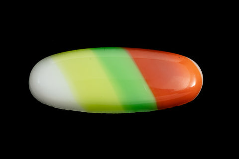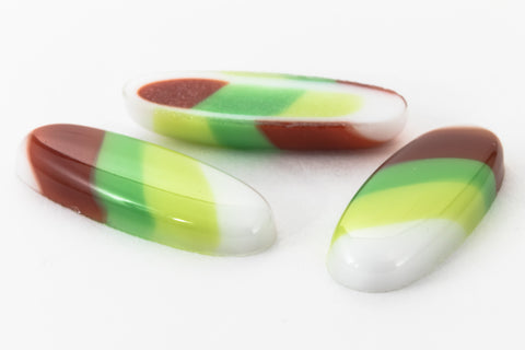 10.06mm x 26.26mm white oval flat back with diagonal bands of lime green, leaf green and brown.