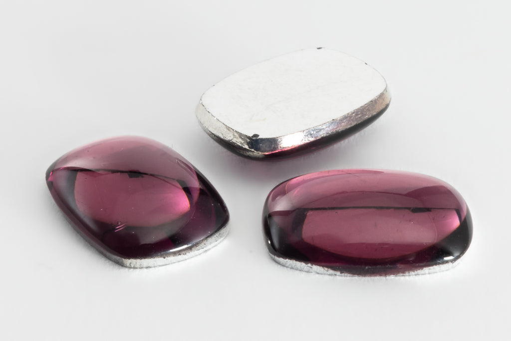 Vintage glass cabochon.10.93mm x 14.8mm domed rectangle flat back with rounded cornersTransparent amethyst with silver foil.Made in Germany or the Czech Republic in the 1960's or earlier.Sold individually.