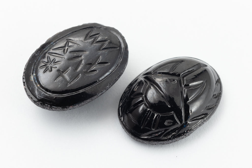 12.62mm x 17.4mm Egyptian Revival style black scarab with hieroglyphs on the back.