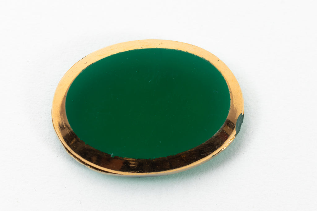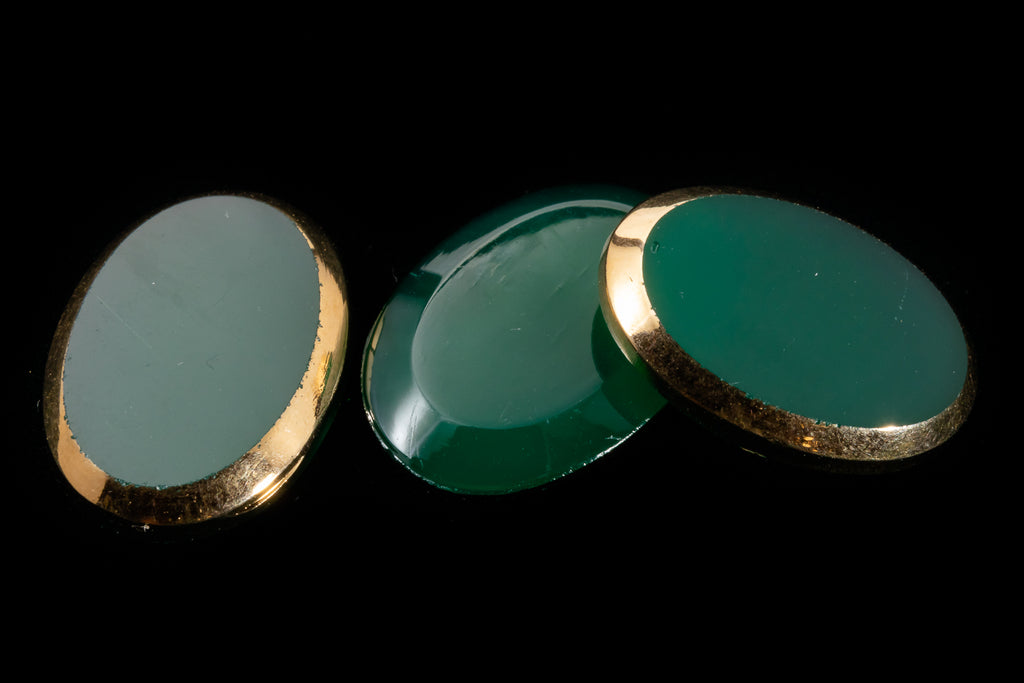 17.73mm x 13mm opaque dark green flat back oval with gold beveled edge.