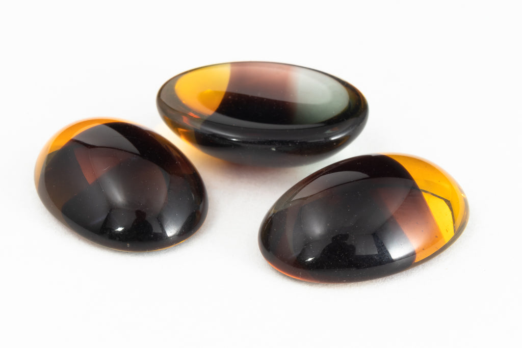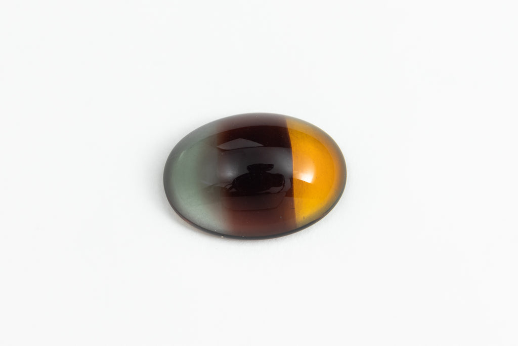 12.88mm x 17.88mm transparent oval flat back with smokey gray, dark brown and topaz stripes.