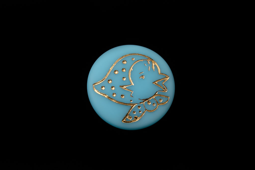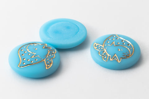 13.6mm baby blue low dome round flat back with gold outline of a chick.