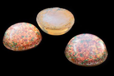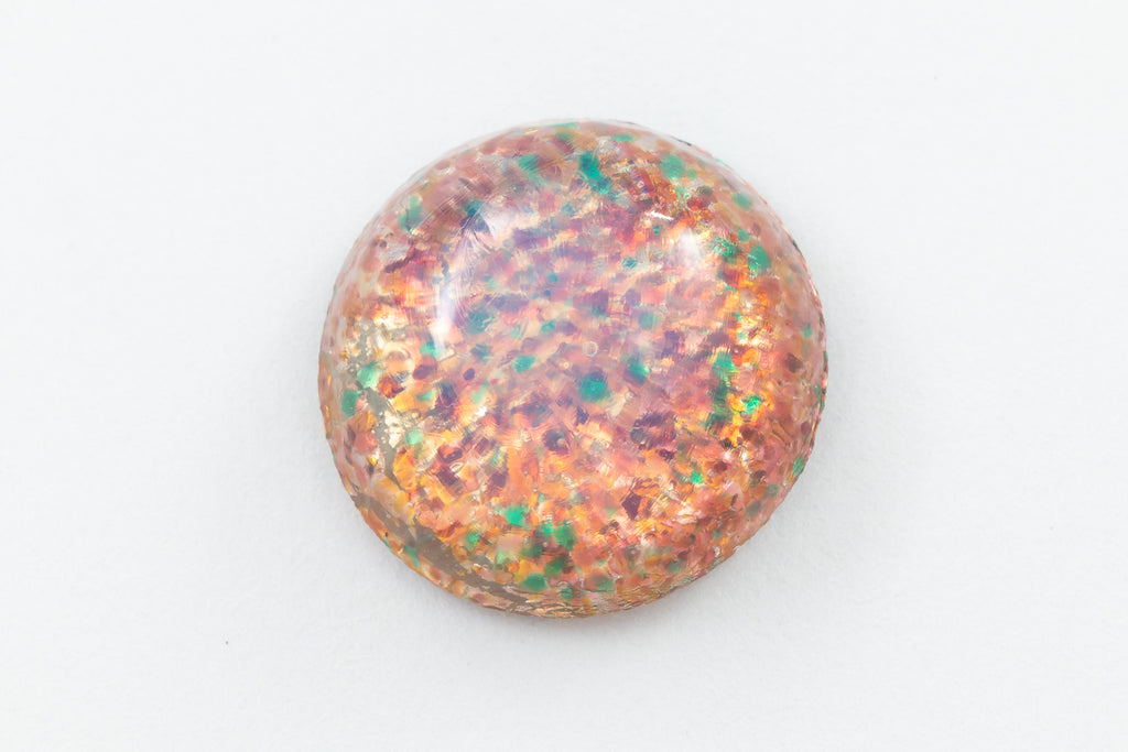 14.7mm domed round flat back.Opal pink with foil flecks of green, pink and gold.
