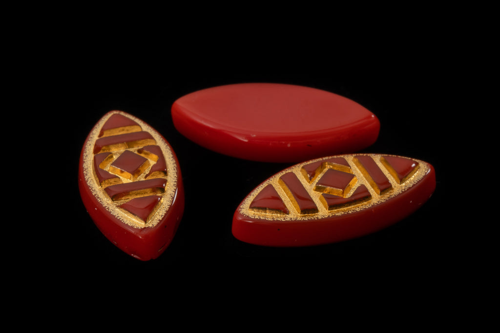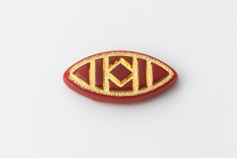 Opaque red with metallic gold geometric design.