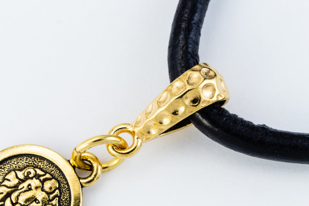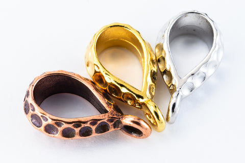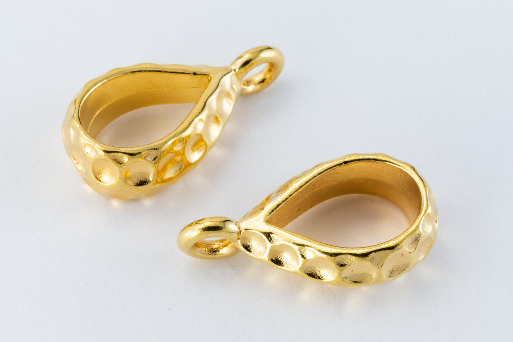10mm x 18mm bright gold hammered bail. Inner diameter of bail 6mm, inner diameter of loop 2mm. Large hole is ideal for working with cord.