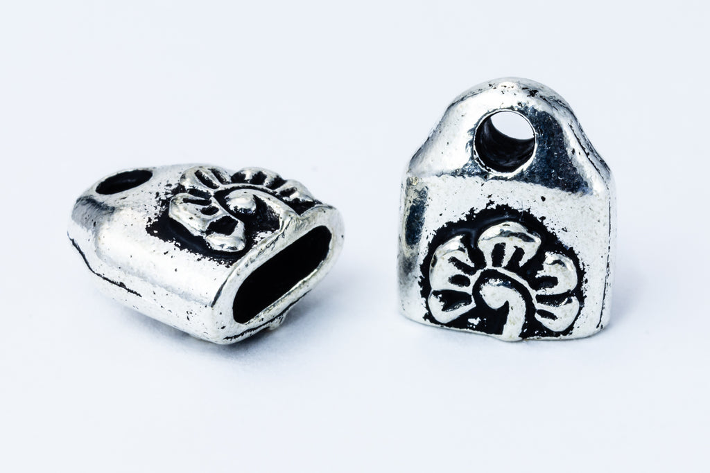 10mm x 8.75mm crimp end cord with delicate blossom and 2mm hole at top.