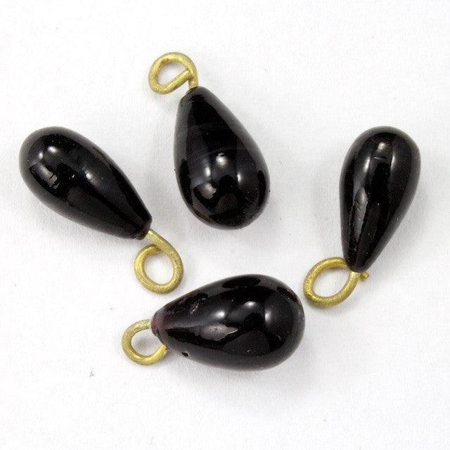 5mm x 10mm opaque very dark purple glass pear shape drop with metal loop at top.