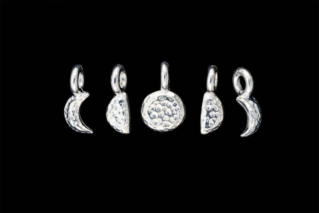 Moon phases charm set- 1 full moon, 2 half moon and 2 crescent moon charms with distressed texture.