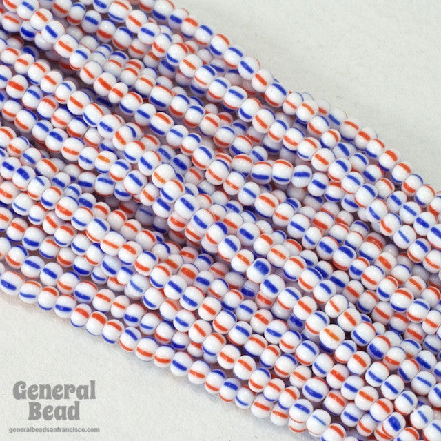 Size 11 opaque white seed bead with red and blue stripes.