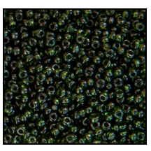 Size 11/0 Charlotte cut transparent dark olive glass seed beads.