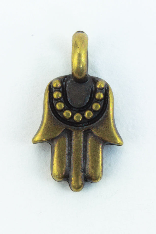 12.5mm x 7mm antique brass Hamsa with loop at top.