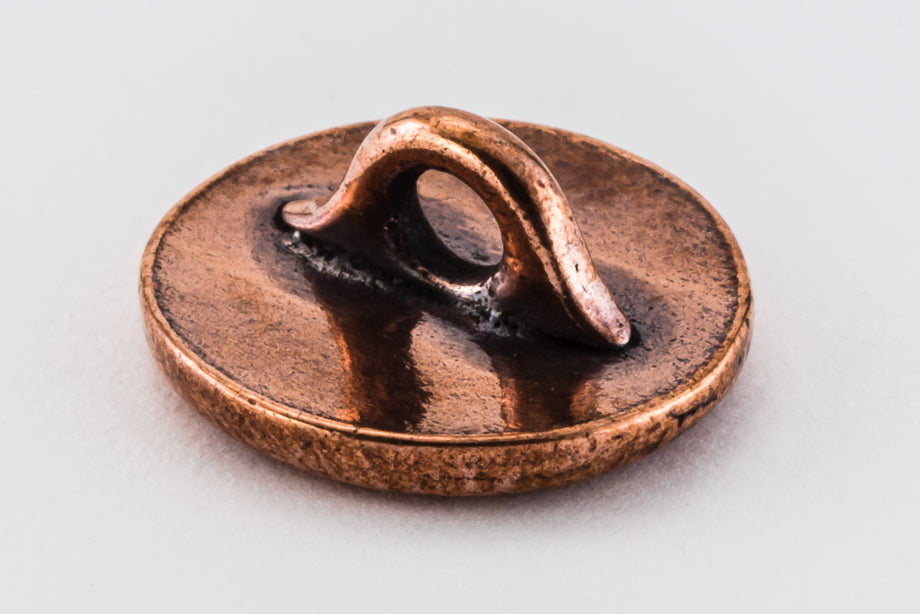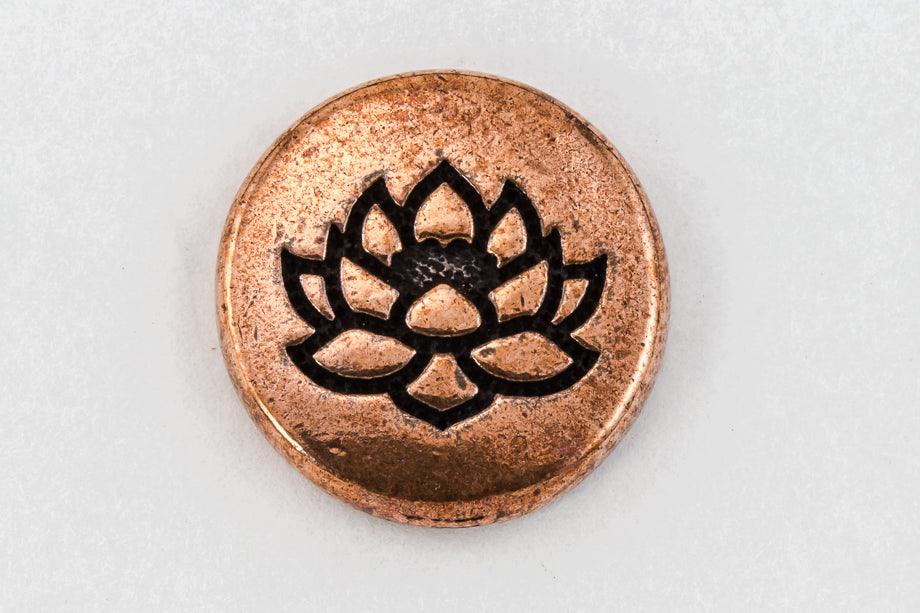 12mm antique copper round pewter button with engraved lotus blossom and 2.4mm shank on back.