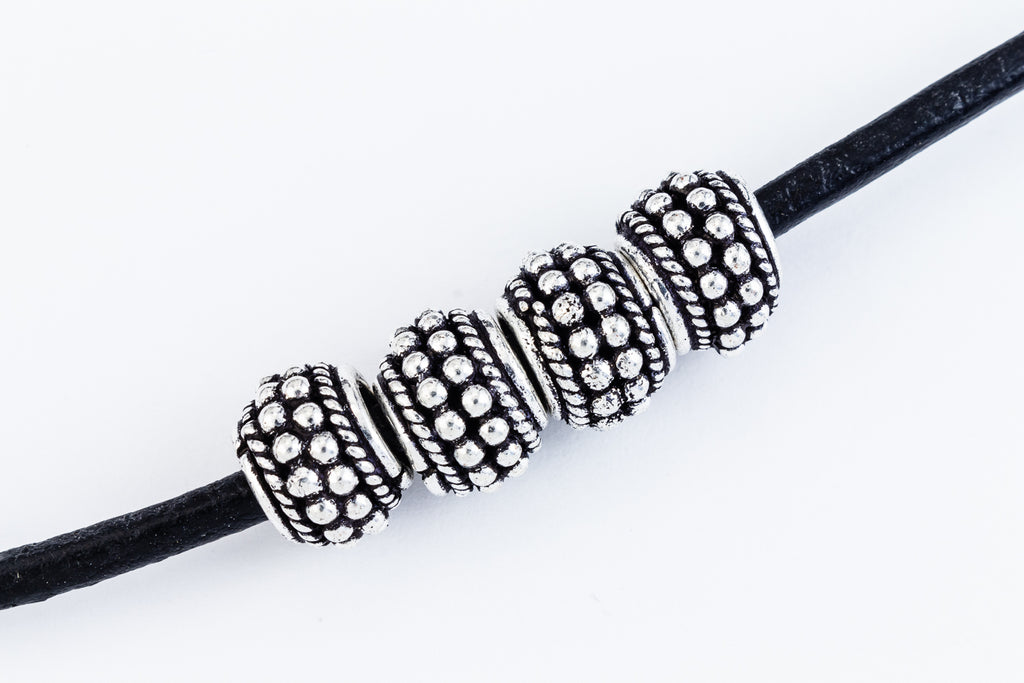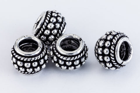 12mm antique silver cylinder bead with double beaded band around center and rope borders.