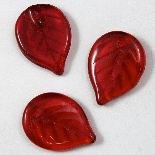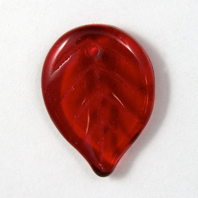 Transparent cranberry leaf with vein detail and pendant hole at top.