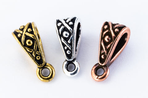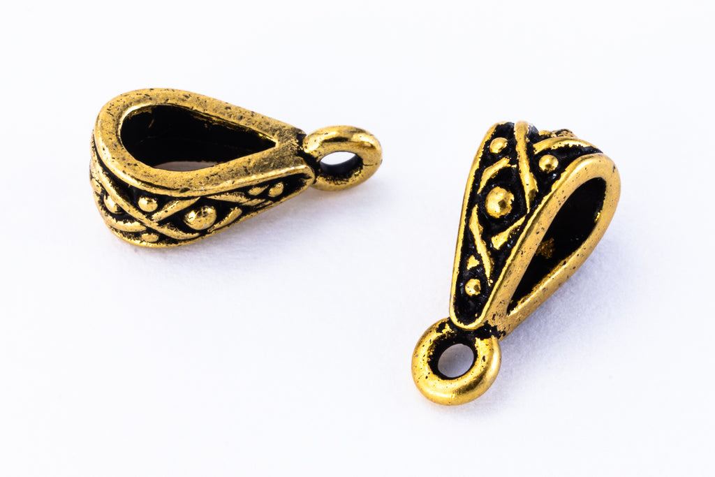 5.25mm x 12.75mm antique gold "Legend" bail. Inner diameter of bail 3mm, inner diameter of loop 1.25mm.