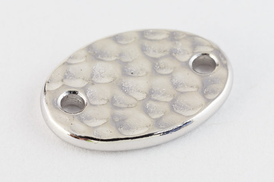 12.8mm x 8.9mm bright rhodium flat oval with hammered texture and hole on either side.