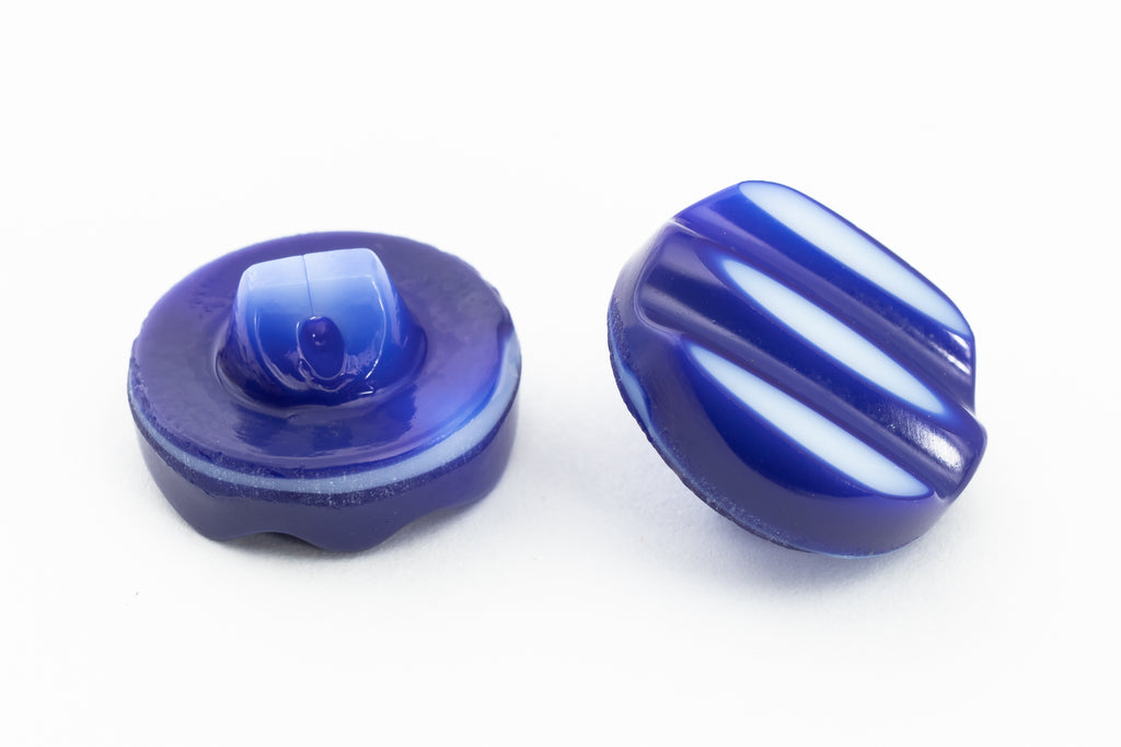 12.69mm opaque Royal blue glass button with 3 white ridges and molded shank on back.