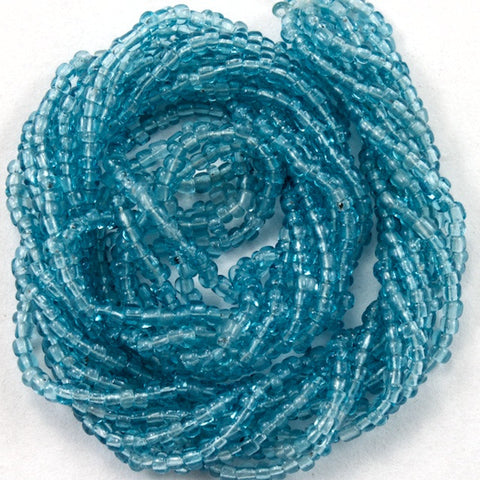 Size 14/0 transparent light aqua antique Venetian glass micro seed beads.