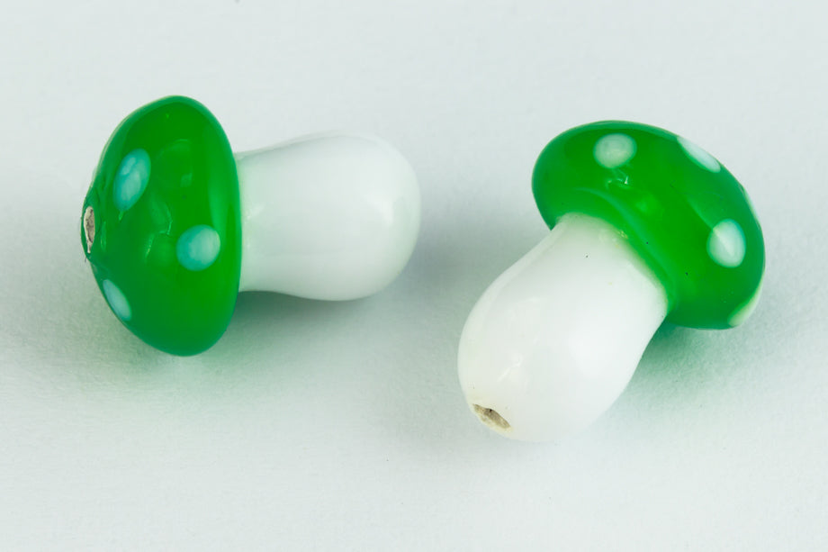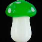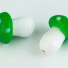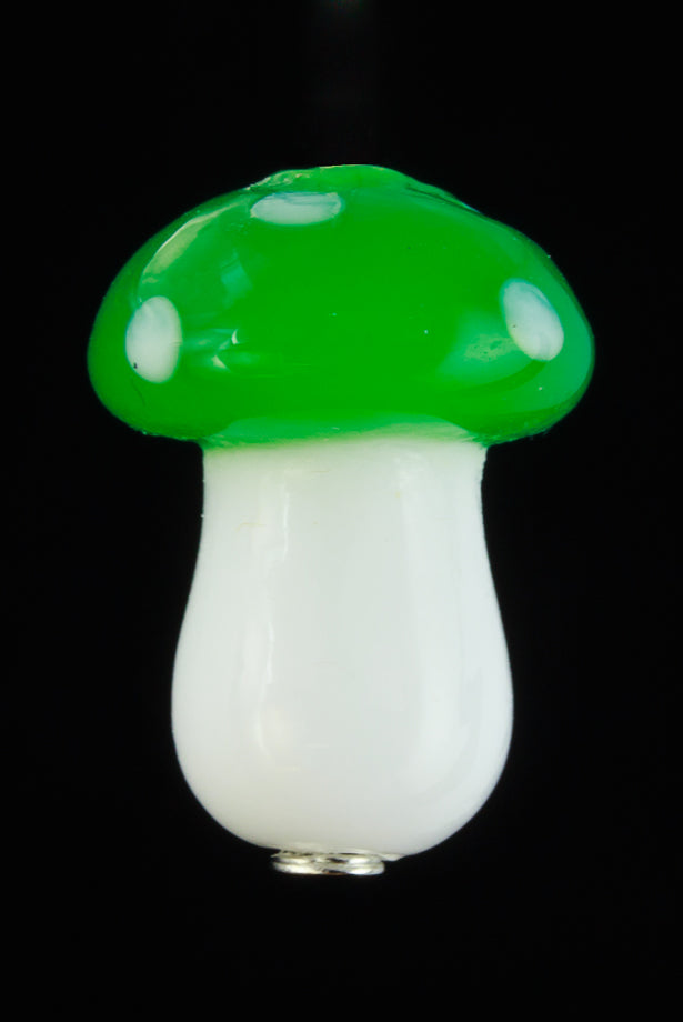14mm x 10mm green and white capped glass mushroom with vertical hole.