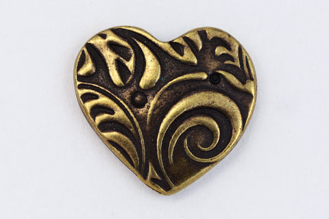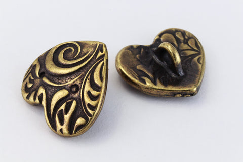 15.4mm x 14.4mm antique brass heart shape pewter button with embossed "Amor" design and 2.2mm shank on back.