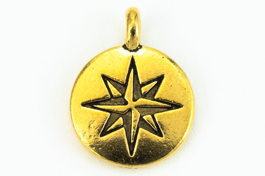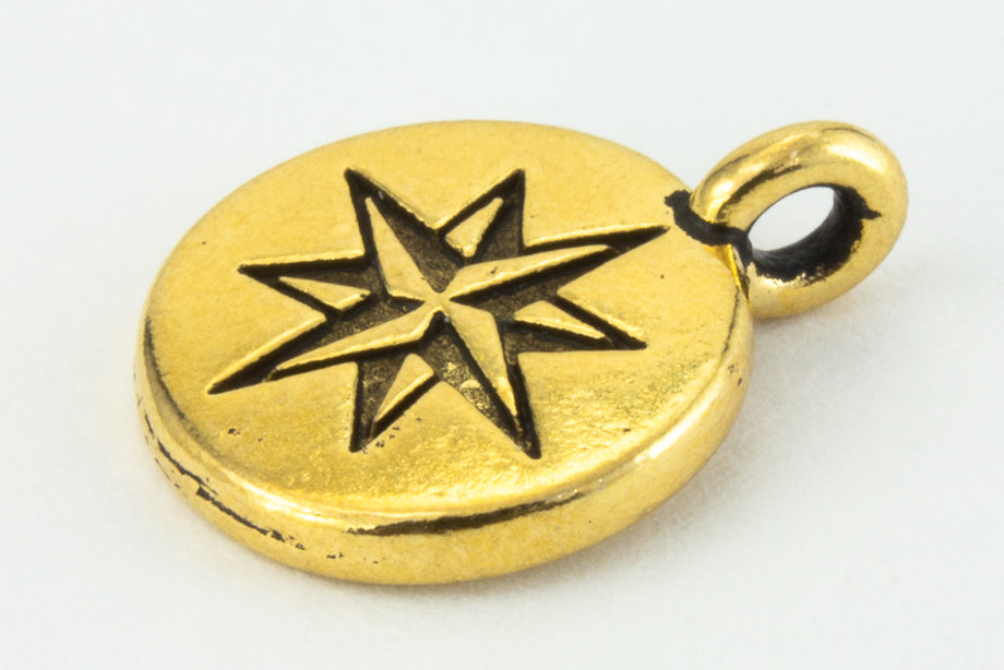 14.5mm x 11.1mm antique gold disc with engraved compass rose. Top loop is 1.7mm.