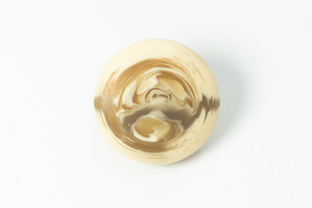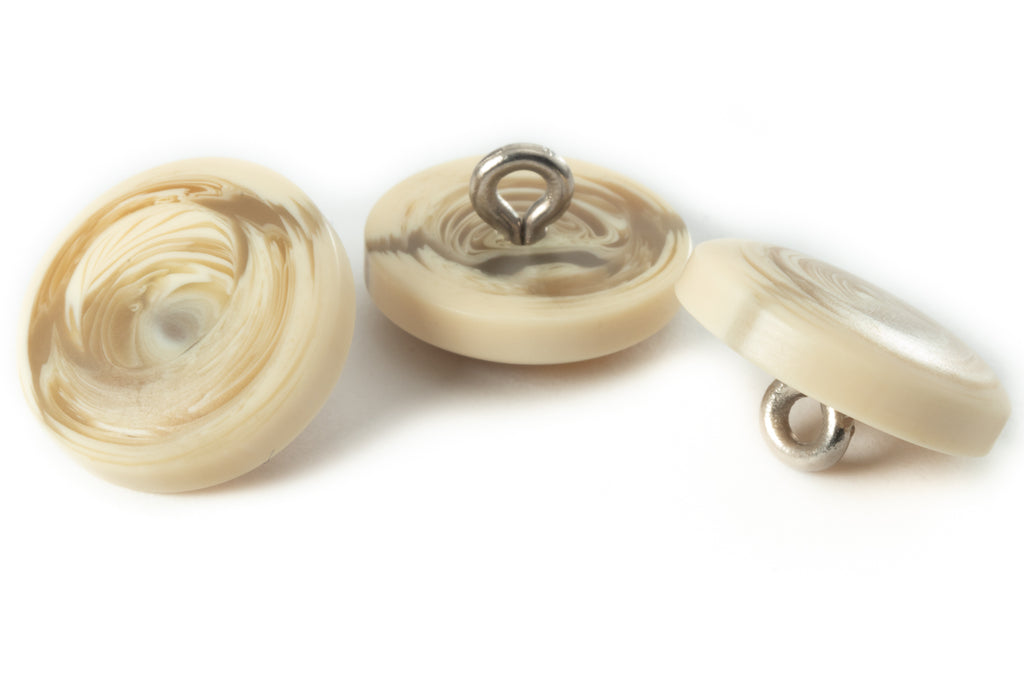 Vintage button.14.75mm domed button with steel shank.3mm thick, loop measures 2mm.Creamy beige swirled with clear and brown.Made in the USA in the 1990's.2 pieces per package.