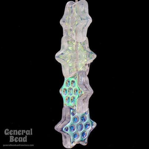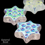 15mm crystal clear pressed glass six point star bead with iridescent coating and dotted surface.