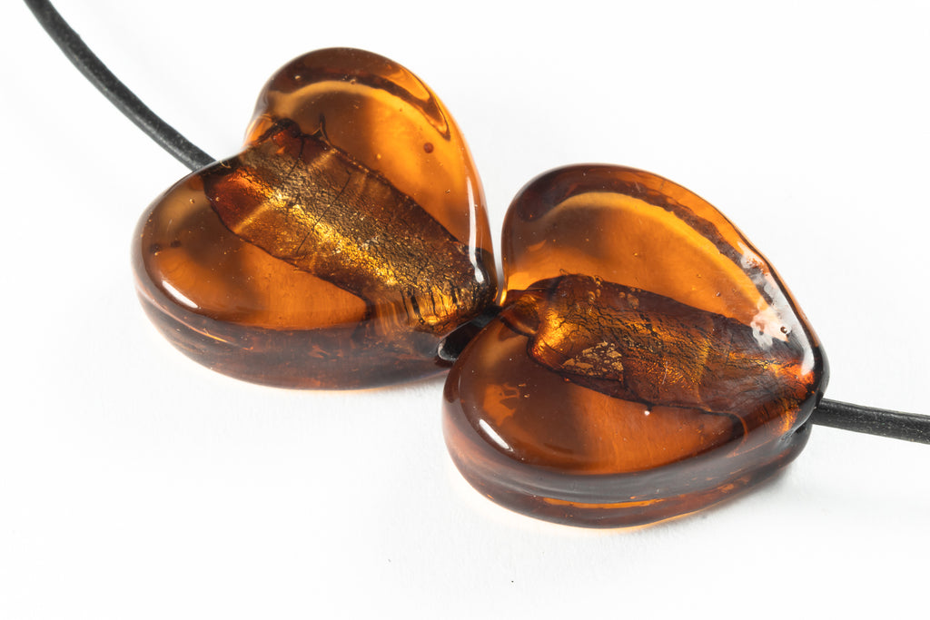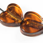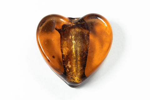 15mm glass heart bead with vertical hole.Amber with silver foil lining. Hole measures about 1mm. Made in China in the 1990's.1 or 12 pieces per package.