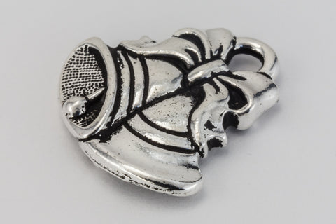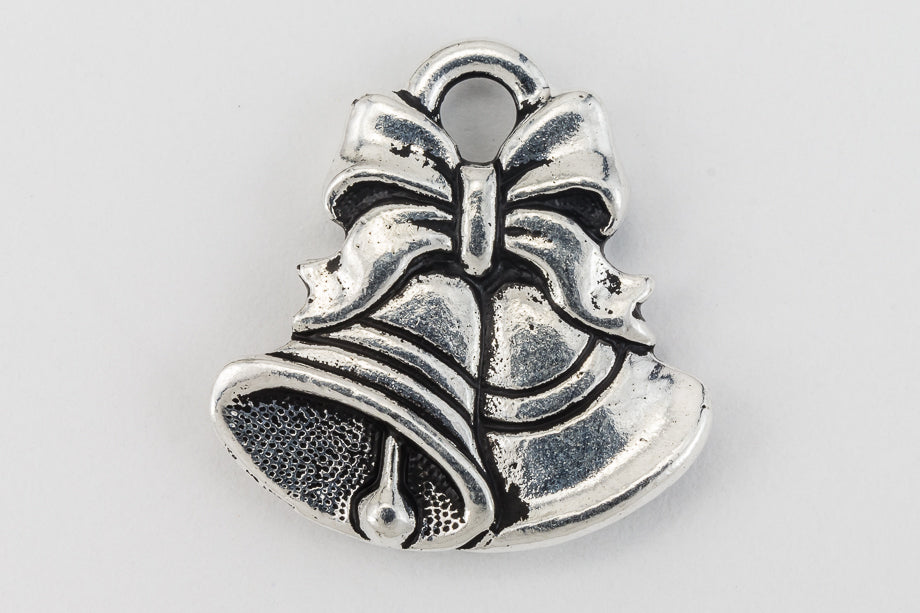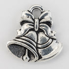 16.5mm x 16mm antique silver pair of bells with festive bow and loop at top. Inner diameter of loop measures 2.25mm.