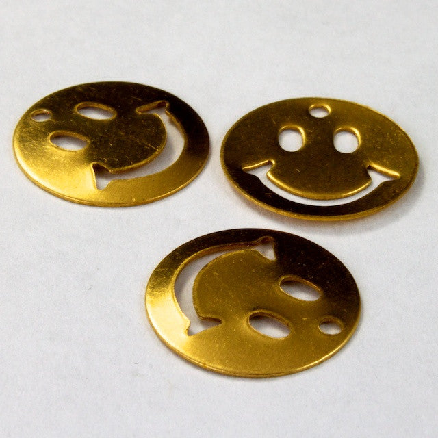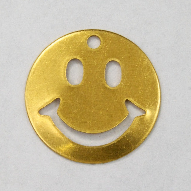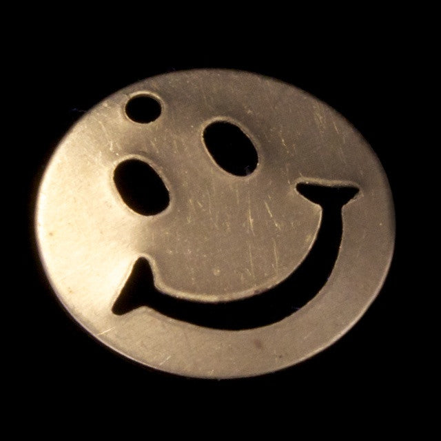 16mm raw brass charm with cut-out smiley face and hole at top.