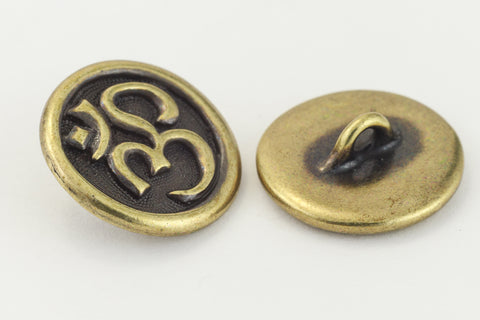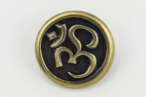 17mm antique brass round pewter button with raised "Om" symbol and 2.25mm shank on back.