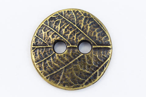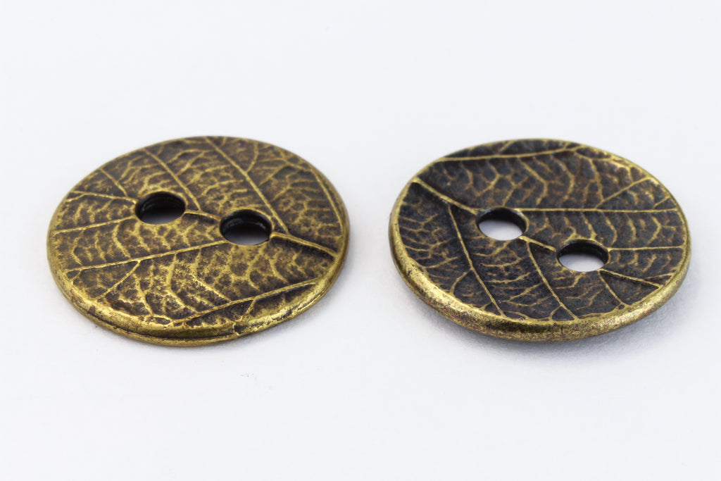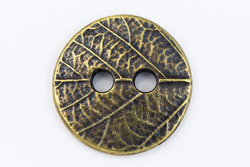 17mm x 17.25mm antique brass round pewter button with embossed leaf vein texture.