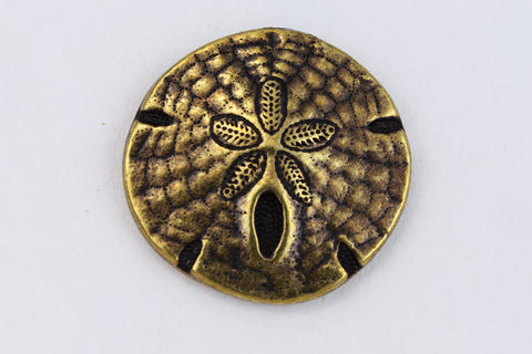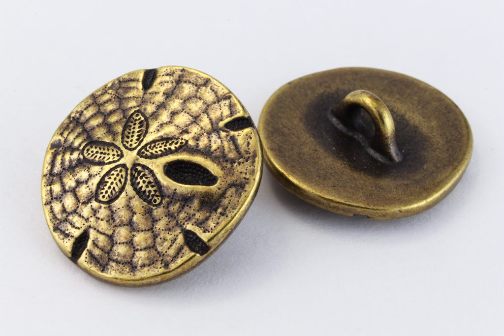 17mm antique brass round pewter button in the shape of a sand dollar with 2mm shank on back.