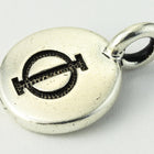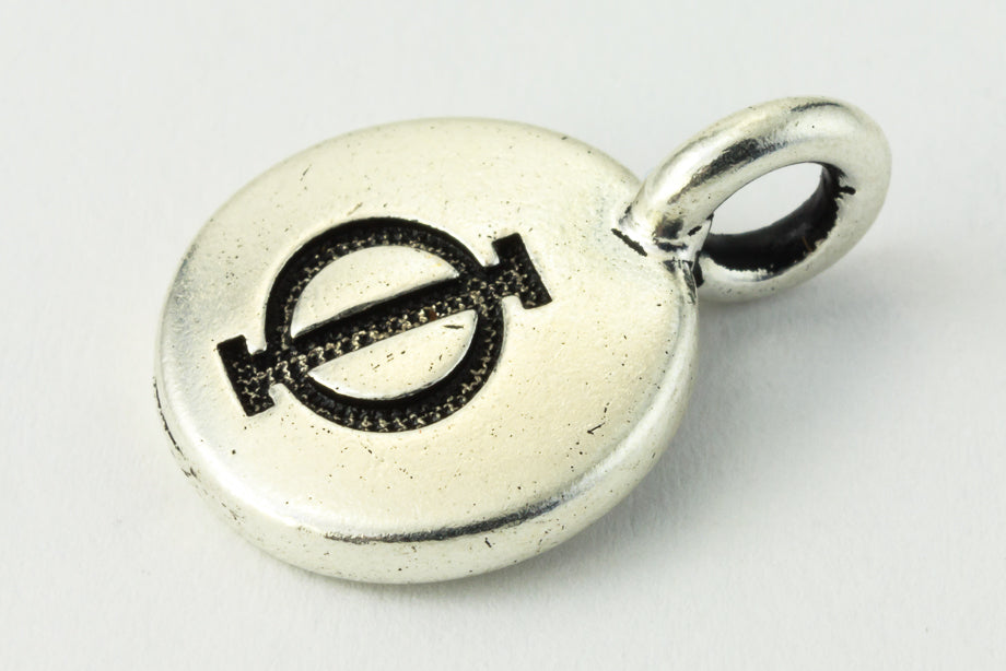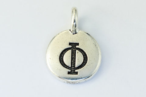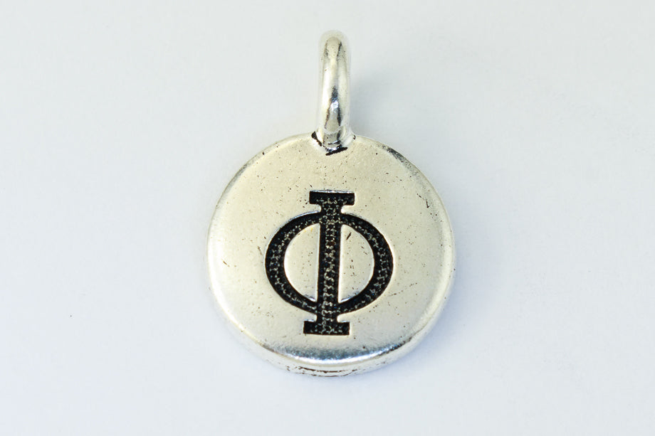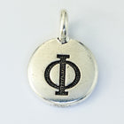 16.6mm x 11.6mm antique silver charm with inscribed capital Greek letter "Phi". 2.6mm loop at top.