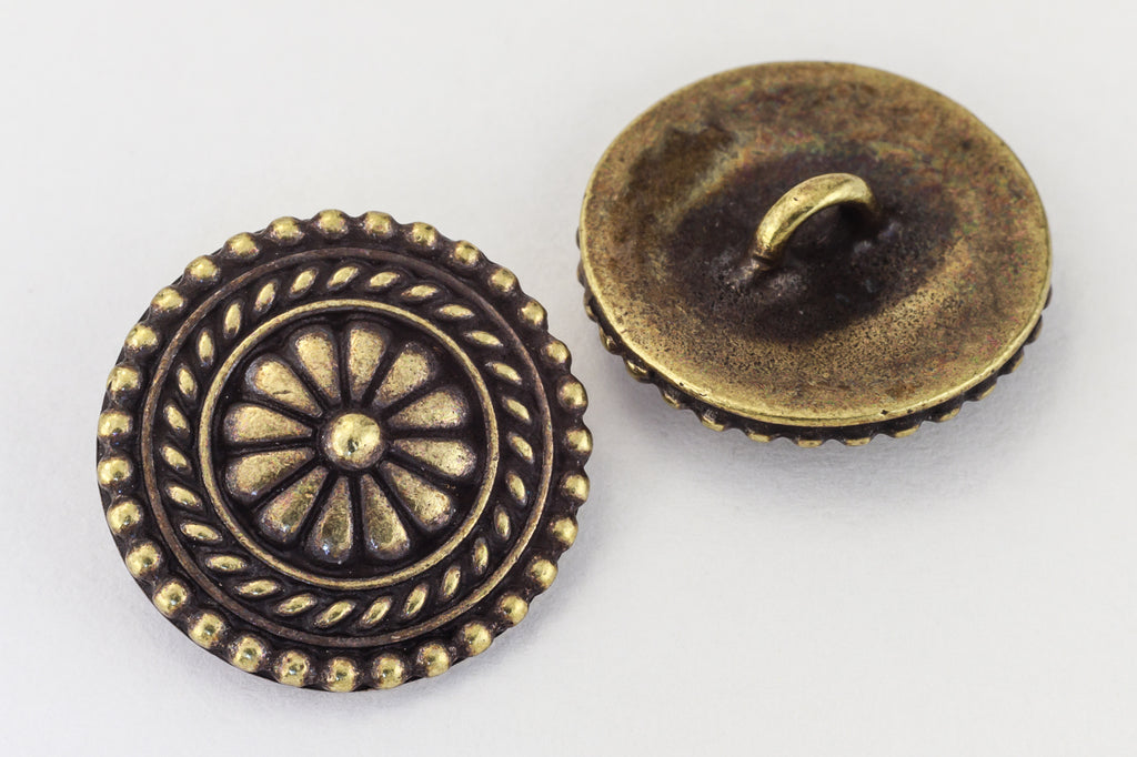 17.75mm antique brass Bali style pewter button with 2.2mm shank on back.