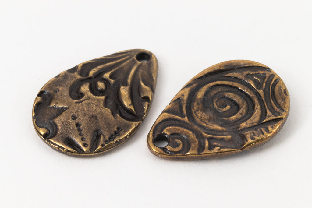 13.7mm x 19.7mm teardrop with "Flora" style embossed floral detail and 1.6mm hole in narrow end.