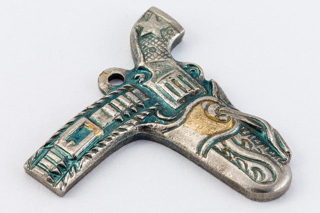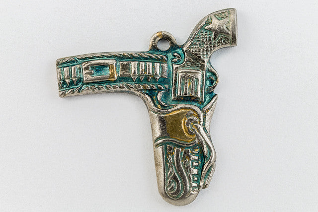 20mm antique silver detailed pistol in holster with loop at top.