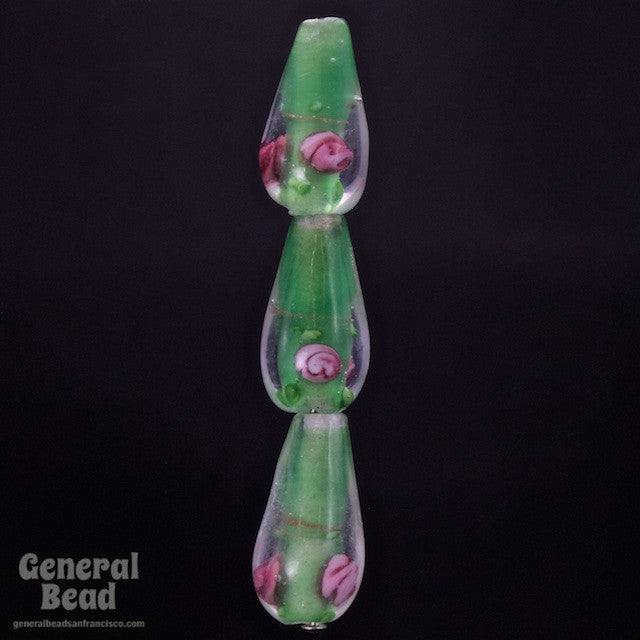 10mm x 20mm clear glass teardrop with leaf green inner core and pink floral decoration.