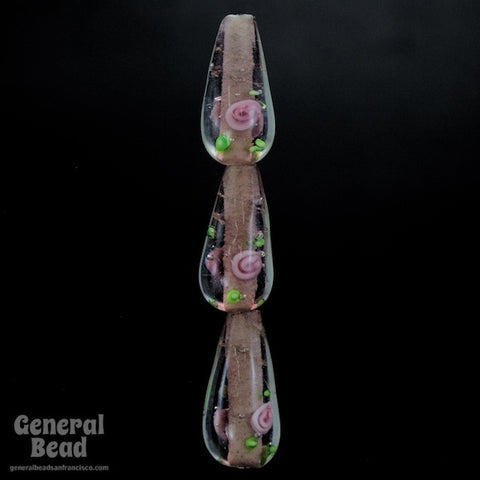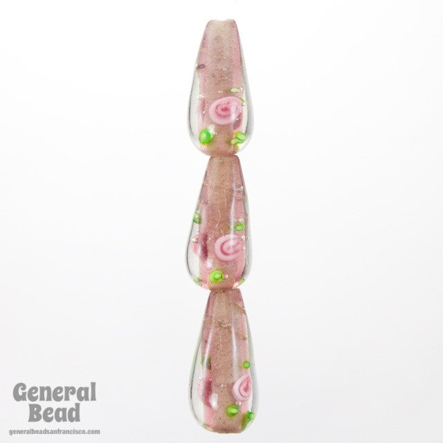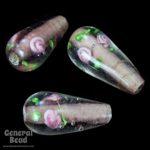 10mm x 20mm clear glass teardrop with light amethyst inner core and pink floral decoration.