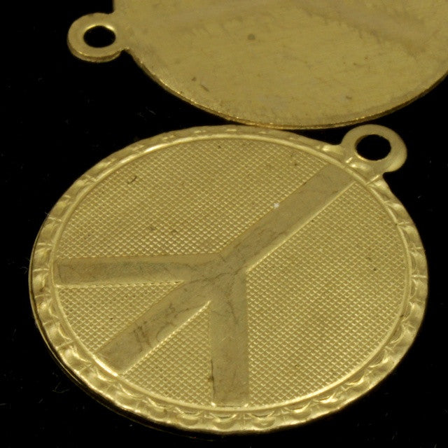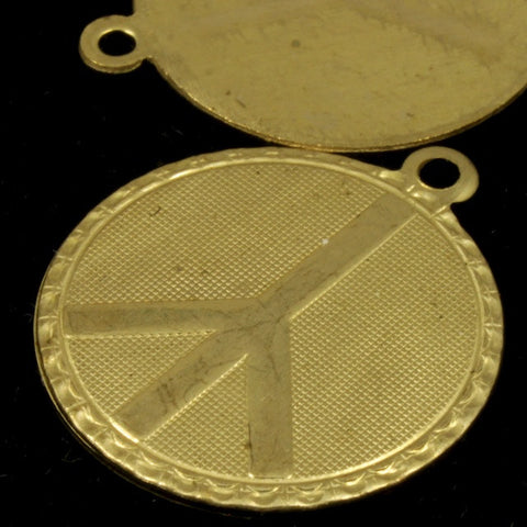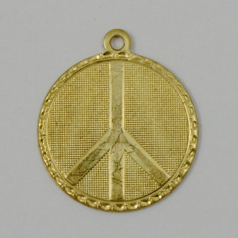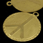 20mm raw brass charm with an embossed peace sign and a loop at the top.