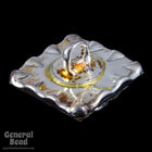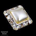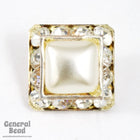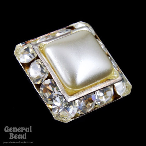 20mm silver tone square rhinestone button with 15mm cultura faux pearl set in center and metal shank on back.
