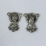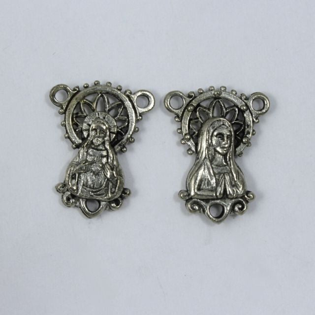17mm x 22mm antique silver tone pewter rosary center with detail of the Madonna on one side and the Sacred Heart on the other.