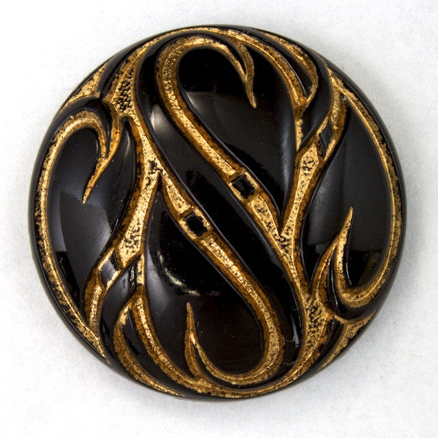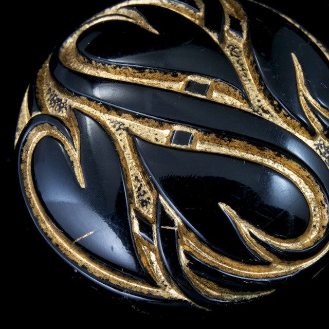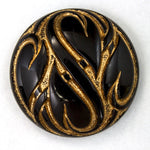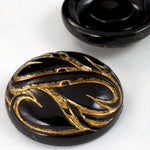 25mm black round low dome flat back with inlaid gold and leaf design.