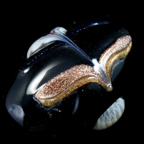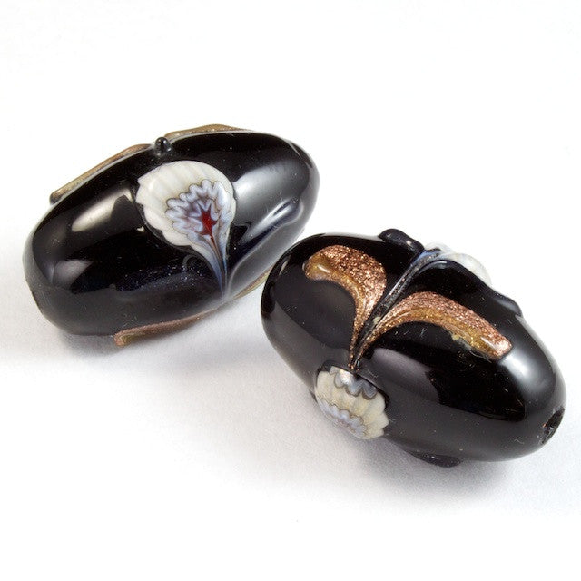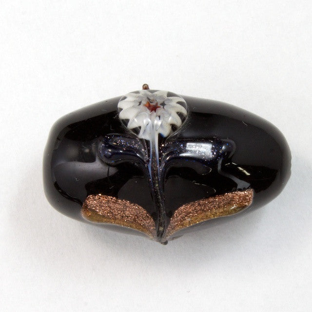 15mm x 25mm black oval bead with white raised flowers on side and gold decoration.