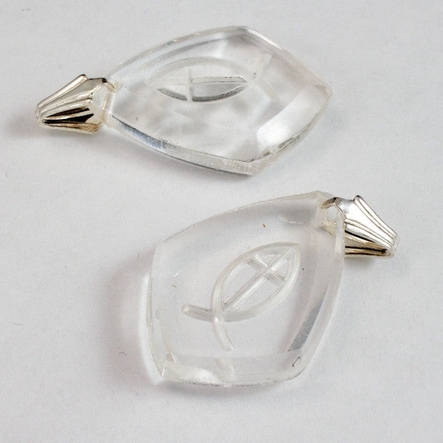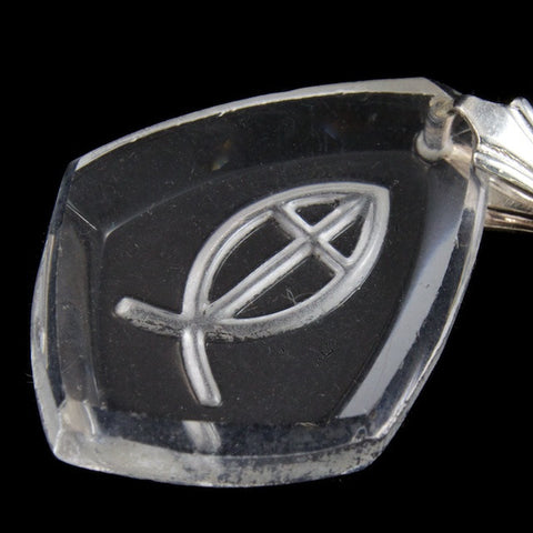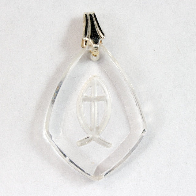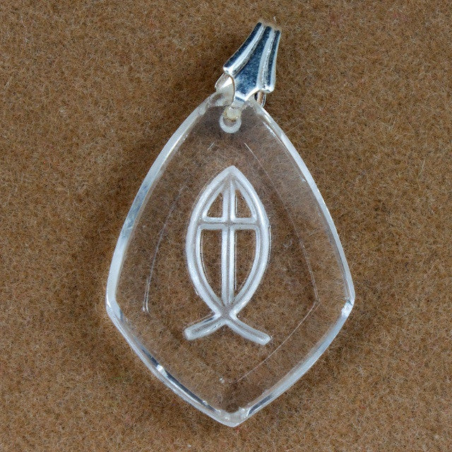 15mm x 25mm clear glass pointed kite pendant with etched fish symbol.