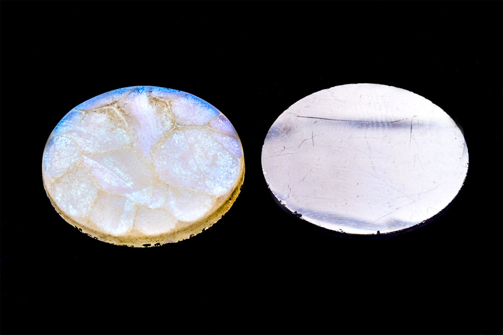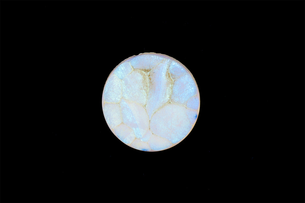 25mm round glass cabochon with irregular crystalline surface.